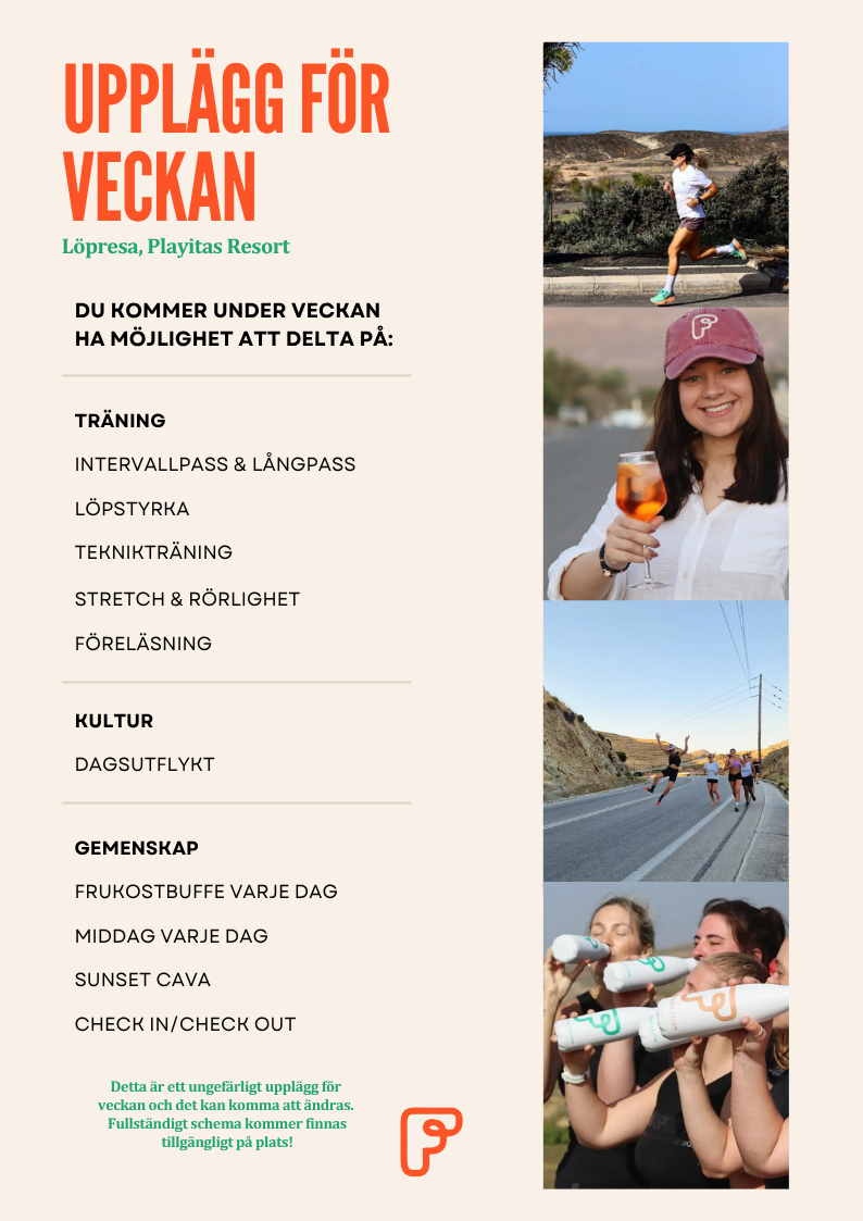Häng med ännu ett år tillsammans med Friendcation på en inspirerande löpvecka till Playitas Resort mellan den 14 april- 21 april 2026. Löpcoach Joanna med assisterande coach Ida Wretling kommer guida dig genom intervaller, långpass, löpstyrka och löpteknik. Du har även möjlighet att delta på en föreläsning för hållbar löpning och det finns självklart utrymme för att testa på andra aktiviteter under veckans gång!