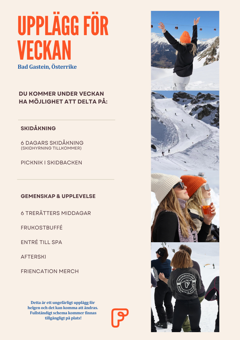 Vad sägs som en veckas skidåkning i Alperna med massa härliga tjejer? Skidåkning på alla olika nivåer i kombination med stökig afterski, mysiga middagar och SPA mellan åken.