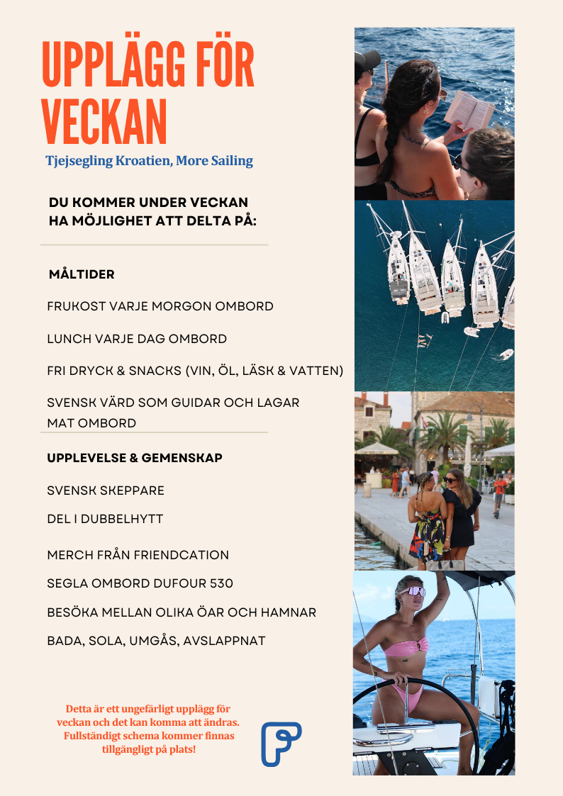 Favorit i repris! Friendcation och More Sailing arrangerar en resa där du som friendcation-medlem har möjligheten att följa med på en seglingsresa i Kroatien sommaren 2026. Ta chansen att upptäcka nya platser varje dag från havet samtidigt som du lär känna nya härliga tjejer.