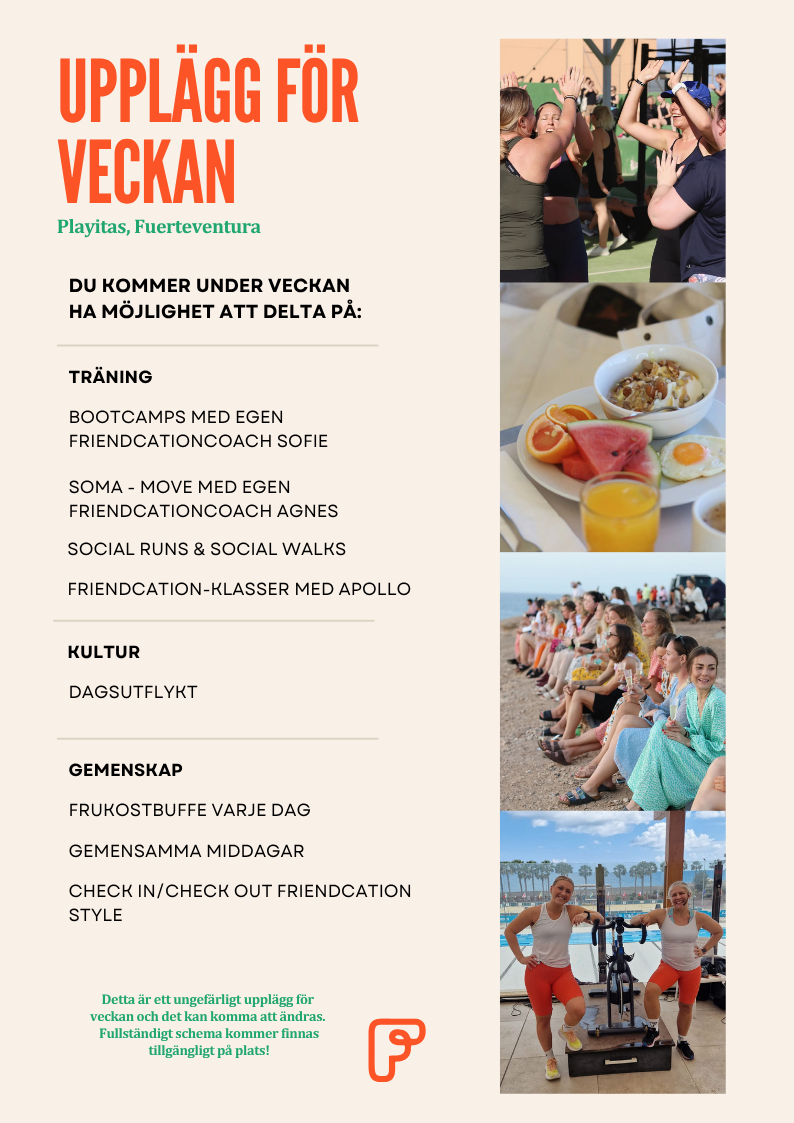 Häng med Friendcation på en avkopplande, men fortfarande utmanande och rolig, upptempo träningsresa till Playitas Resort i Mars 2026. Vi skapar utrymme för både rörelse och vila, och erbjuder ett program fyllt av svettiga pass, utflykter, gemenskap, coach-ledda cirklar, rörlighetsträning, Soma Move och träningsformer du kanske aldrig har testat tidigare.