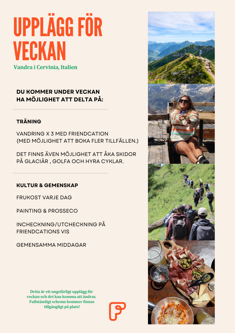 Som med alla Friendcationresor så erbjuds skräddarsytt program som inte går att boka någon annanstans. Detta är en resa för dig som vill resa på egen hand men ändå tillhöra en grupp, träffa nya vänner och vara del av en ny spännande gemenskap med tjejer som älskar äventyr i vackra miljöer.